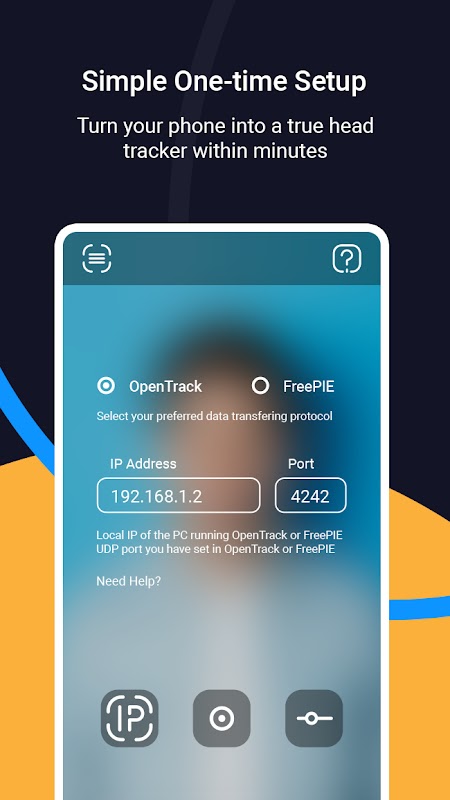 1. Toque el icono de IP en HeadMob e ingrese la dirección IP local de su PC y un número de puerto adecuado con respecto a OpenTrack o FreePIE
