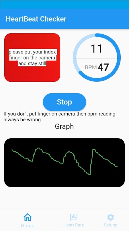 To use this heart rate monitor app, just put your finger on the phone's camera and stay still, the heart rate should be shown after several seconds.