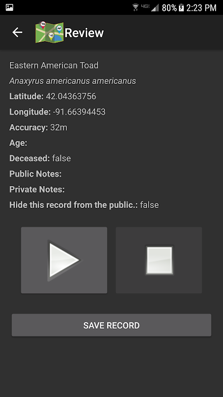 ¿Quién puede ver los registros que se crean? Hay dos niveles de visibilidad para los registros. Sólo usted y HerpMapper socios tienen acceso a todos los datos de los registros que se crean. Otros usuarios de HerpMapper y el público en general sólo pueden ver información muy básica en sus registros - que no tienen acceso a los datos exactos localidad. Ninguna de las imágenes adjuntas a un registro de metadatos tienen su localidad despojado, para que puedan ser vistos por todo el mundo en el sitio web HerpMapper, lo que significa que también puede ver los reptiles fríos siendo grabadas por otras personas de todo el mundo.