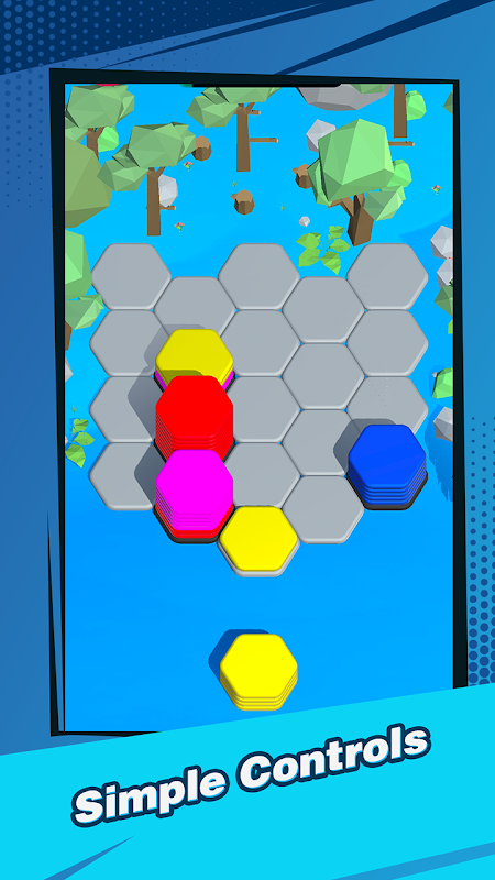 Eliminación Hexagonal: Apila diez hexágonos del mismo color para eliminarlos y ganar puntos.