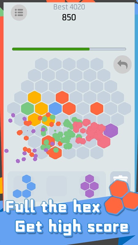 Fácil de manejar: solo tienes que arrastrar los bloques desde la parte inferior de la pantalla a la zona de eliminación hexagonal y colocarlos en la posición correcta para comenzar tu desafío.