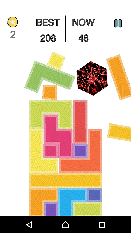 (The goal is to keep the six hexagone figure on the tower of blocks and not let it fall off for as long as possible and get star block to unblock a new six hexa )