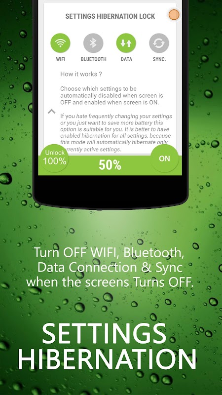 Hibernate - Real Battery Saver puts all the battery killing apps and settings in to deep sleep mode to ensure huge battery saving when the screen is off.