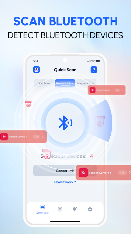 ✅ Escaneo de dispositivos Bluetooth: algunas cámaras ocultas utilizan tecnología Bluetooth para transmisión de datos o control remoto. Cam Spy busca dispositivos Bluetooth cercanos y señala cualquier conexión desconocida o sospechosa que pueda estar asociada con una cámara oculta.