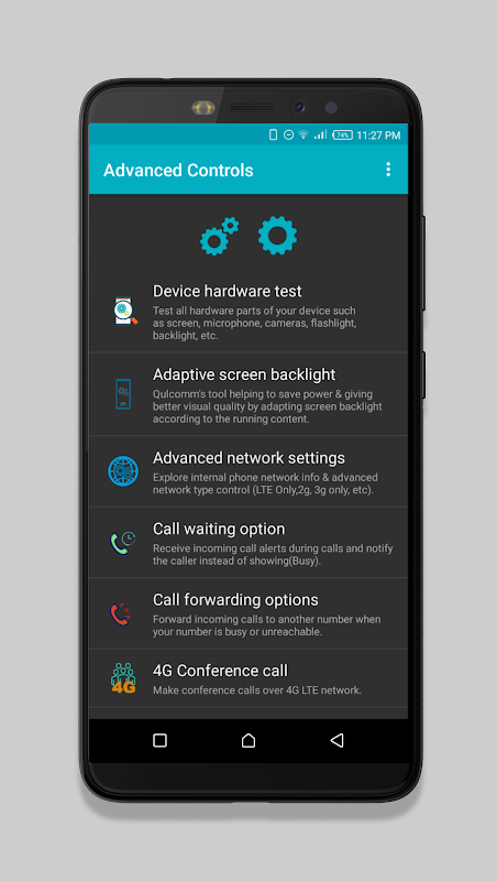 Los controles avanzados pretenden permitirle utilizar algunas funciones internas útiles que están ocultas de forma predeterminada, como la prueba de hardware del dispositivo, más configuraciones de red, llamadas de conferencia 4G, etc.