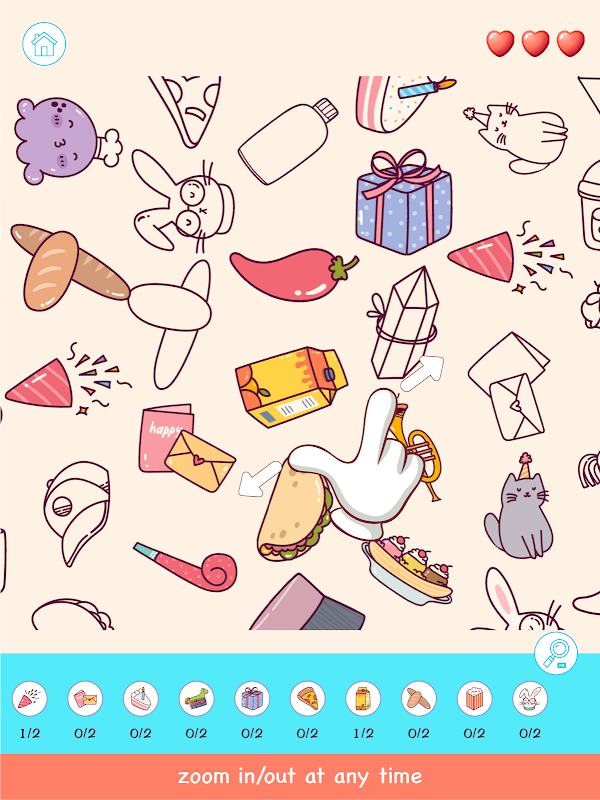 Un toque es lo único que se requiere y los objetos encontrados se iluminarán. ¡Déjalos brillar en la tierra oscura y gris! Solo recuerda que tienes tres corazones en cada nivel. A medida que avanzas en los niveles, vendrán más desafíos y diversión en el camino. Nunca te detengas, se proporcionan consejos siempre que necesites ayuda y solo quieras tomártelo con calma. Acercar y alejar puede ayudarte a encontrar los objetos ocultos más rápidamente.
