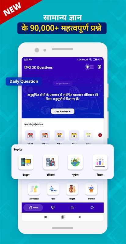 APRENDE Y GANA: puedes ganar recompensas de hasta 500 INR cada semana participando en cualquier concurso en vivo (si es en vivo). Sólo tienes que comprobar si hay algún concurso en marcha. En caso afirmativo, simplemente inicia sesión y comienza a jugar. ¡Eso es todo! Juegue Quiz o aprenda nuevas preguntas de GK diariamente con esta aplicación en hindi.