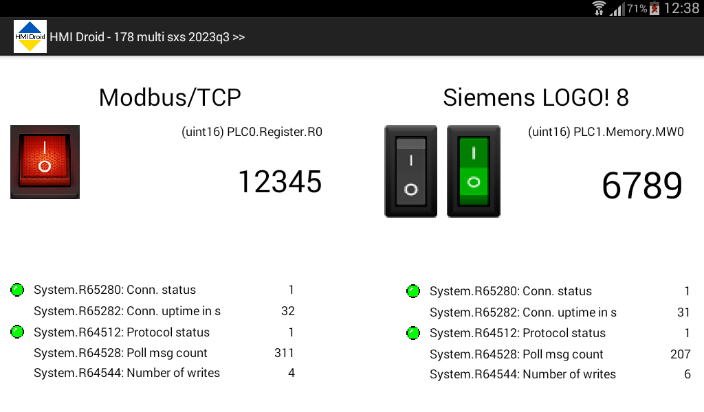 Panel de mando para varios PLC industrial. La comunicación a través de Bluetooth, WiFi o móvil internet con protocolos de Comli, Modbus/TCP (class 0 y 1), Modbus RTU class 1, SattBus Comli, Siemens Fetch/Write o Siemens S7 Communication (ISO on TCP). También se puede ejecutar en dispositivos fijos como reproductor multimedia o Raspberry Pi y conexión Ethernet cableada.