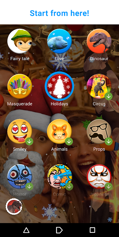 Vea cómo cae la nieve y a Papá Noel volar con su reno junto a un precioso árbol de Navidad con un montón de regalos. ¡El tema Navidad para Efecto de realidad aumentada le permite disfrazarse de duendecillo, ponerse una larga barba blanca o cuernos de reno y hacer fotos navideñas inolvidables!
