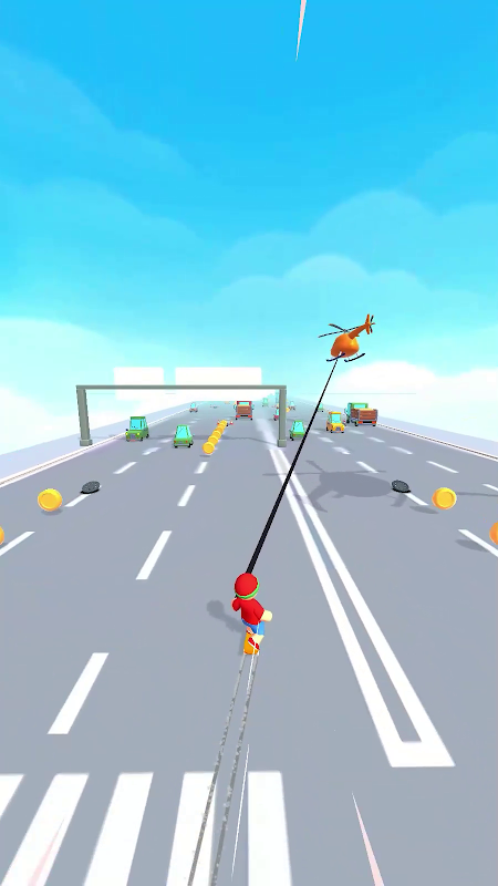 Lanza tu cuerda para engancharte a coches, señales o helicópteros y salta de uno a otro para terminar rápido. Ten cuidado con los obstáculos y el tráfico. ¡Disfruta de tu paseo en patineta a toda velocidad!