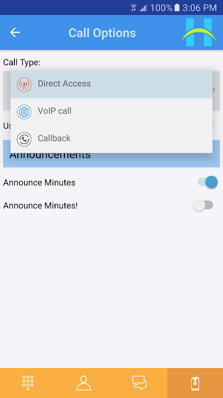 Fácil de usar: Eres dueño de número de celular es su cuenta con Horizonte Talk; se obtiene un código de acceso en el mensaje SMS o una llamada de teléfono para autenticar su número. Una vez autenticado, utilice teclado de marcación para marcar cualquier número en el mundo o seleccionar un número de teléfono de sus contactos guardados en el teléfono. Horizonte Talk aplicación hará el resto para usted llamando automáticamente ese número utilizando el método seleccionado llamando (por defecto: Acceso Directo / Local). No hay necesidad de recordar un alfiler o marcar un número de acceso en primer lugar.