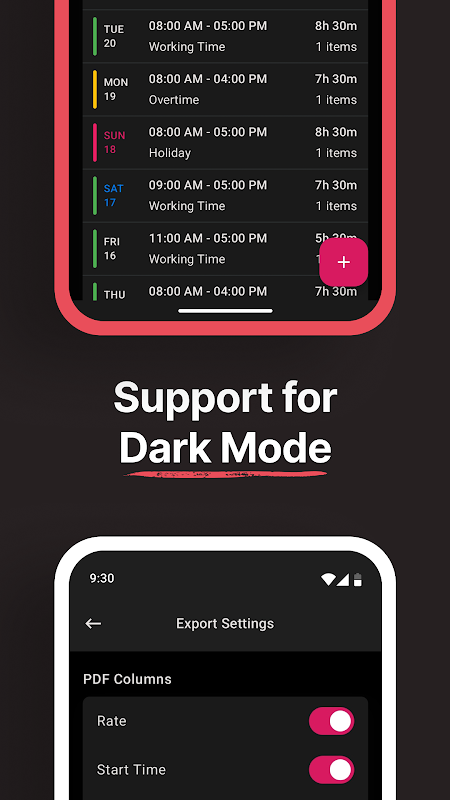 Establece tu tarifa por hora y usa la app como tu calculadora personal de horas o calculadora de tarjetas de tiempo. Obtén resúmenes completos de tus horas e ingresos, y exporta tu hoja de horas en formato PDF o Excel para facturas, nóminas o informes.