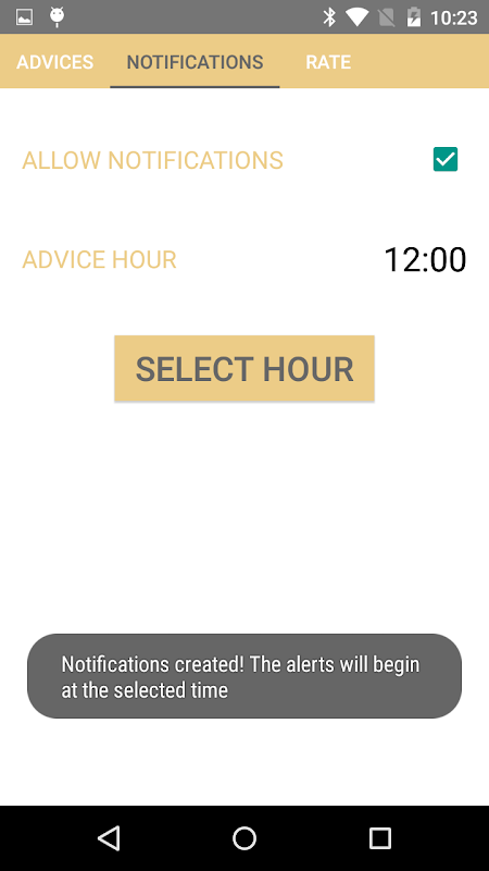 En la segunda sección podrás administrar la aparición de una notificación diaria con el título del extracto correspondiente. Una vez que permites las notificaciones, a partir del día que lo haz habilitado, en los días siguientes verás un extracto distinto cada día. Tocando en la notificación, podrás acceder a la app y ver su descripción.