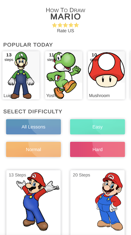 Todos los dibujos se dividen en muchos pasos detallados, repitiéndolos, puedes dibujar cualquier personaje en Super Mario Bros. Incluso si nunca has tenido un pincel en tus manos, ¡nuestra aplicación es adecuada para ti! Créeme.
