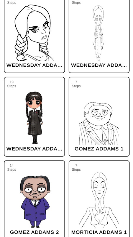 ¿Qué hacer en la aplicación? Para comenzar, seleccione el personaje que desea dibujar. Antes de eso, no olvides llevar una hoja de papel, un lápiz y ropa para lavar. ¡Después de elegir un héroe, comienza la lección! Repita todos los pasos que se dan en la lección y dibujará fácilmente el personaje seleccionado. Créeme, no necesitas experiencia ni habilidades de dibujo. ¡Todo saldrá bien! ¡Sigue las lecciones de la aplicación Cómo dibujar el miércoles Addams 2022 en la vida real paso a paso y el resultado no tardará en llegar!