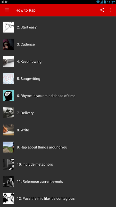 Nuestra aplicación How to rap tiene algunos consejos geniales para los principiantes, para comenzar a rapear de algo. Lo mejor de todo es que se hace en pasos que debes seguir para aprender la técnica de freestyle rap