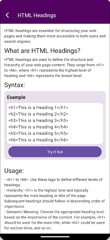 La aplicación "Aprende HTML" tiene una interfaz de usuario muy sencilla e intuitiva. Es la mejor aplicación para aprender el lenguaje de programación HTML gratis. ¿A qué esperas? Descárgala ahora y conviértete en un experto en programación HTML.