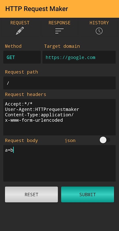 HTTPrequestmaker es una aplicación simple y poderosa que permite falsificar solicitudes HTTP. Es compatible con HTTP y HTTPS y todos los métodos HTTP más utilizados: GET, POST, PUT, DELETE, OPTIONS y más.