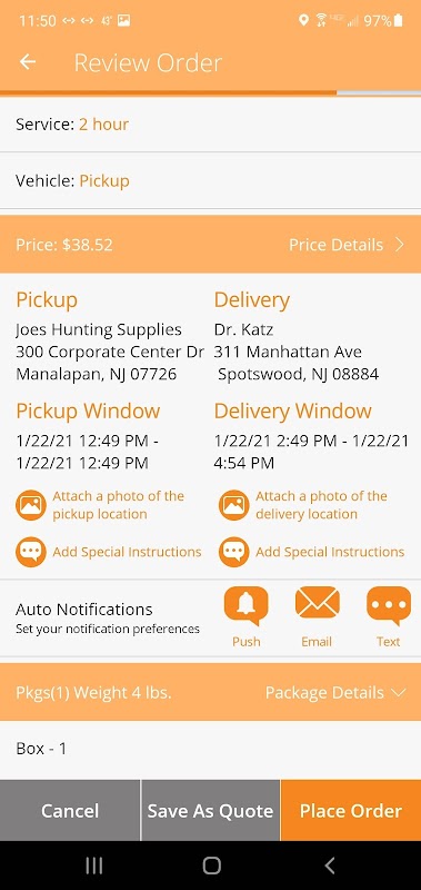 La entrada de pedidos nunca ha sido tan fácil. Agregue sus paquetes, busque direcciones basadas en su ubicación GPS, revise su costo y pague directamente desde la aplicación. Realice pedidos en segundos o profundice en más detalles, como escanear códigos de barras para agregar paquetes, adjuntar fotos a las paradas y configurar sus notificaciones.