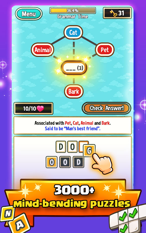 Deduce your answer by racking your brain for synonyms and associating nearby words. Figure out how seemingly random words are connected and keep on filling in the blanks until you complete each level! Feeling stuck? Can’t seem to guess that one word? Get a clue! You have a variety of tools at your disposal. Use them well.