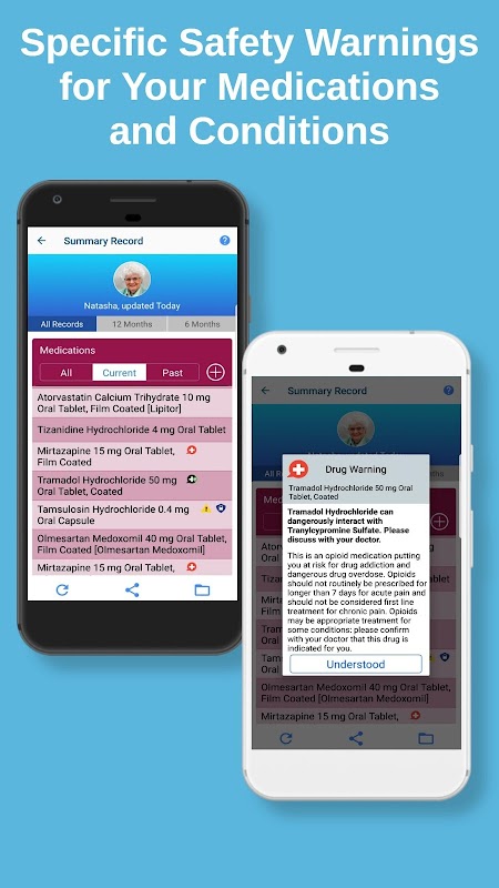 Ya sea que se trate de los medicamentos que tomas actualmente, uno nuevo recetado recientemente, una afección existente o nueva, iBlueButton utiliza IA para generar advertencias de seguridad personalizadas y mejores prácticas de cuidado basadas en pautas bien establecidas. iBlueButton también ofrece alertas relacionadas con la COVID-19, incluyendo una alerta si corre riesgo de contraer una infección grave por COVID-19 y una alerta sobre su elegibilidad para recibir la vacuna contra la COVID-19.
