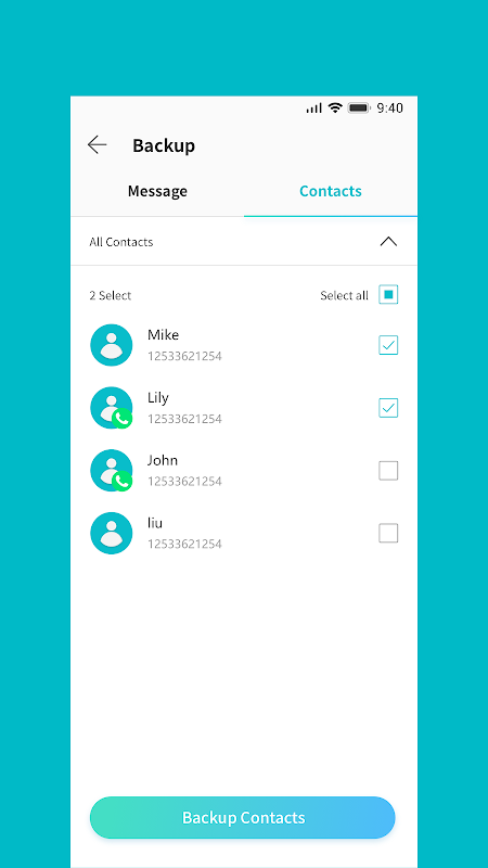 * Backup phone contacts and WhatsApp contacts to standard VCF files;
