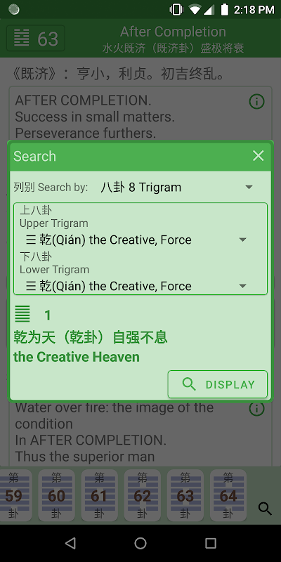 Esta aplicación también tiene una página de adivinación, donde haces seis lanzamientos para derivar con una lectura de hexagrama. Cada hexagrama contiene una perspectiva / juicio general (卦 辭) sobre la adivinación; las declaraciones de simbolismo (象 辭 relacionadas con los 8 trigramas superior e inferior 八卦); y una breve declaración de hexagrama (彖 辭 tuàn).