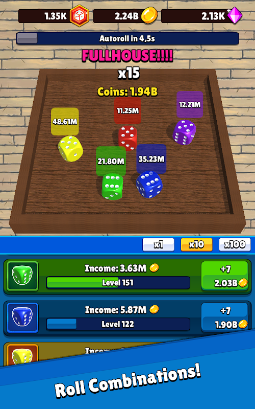 La aplicación Dice Rolling añade emoción y la alegría de ganar. Cada vez que tiras los dados, tienes la oportunidad de conseguir combinaciones de póker únicas y multiplicar tus ganancias. También hay un sistema de prestigio: reinicia tu progreso para obtener bonificaciones y aumentar tus ganancias futuras con el juego de dados inactivo.