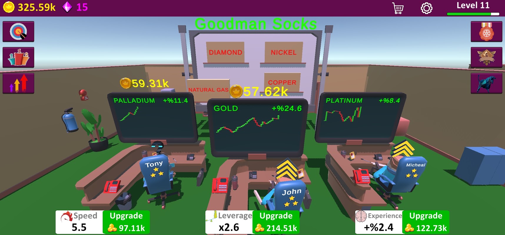 Your goal is to become a crucial part of trading upgrade games and use your speed to multiple the trade tycoon profit and leverage for the trading manager or broker. Enter any of the 5 different trade market offices and help 3 traders in every office to buy and sell different valuable items. The game promotes commodity trading, so you can help the broker buy and sell items like gold, silver, cotton, rice, bytecoin and even currency pairs of USD or Euros.
