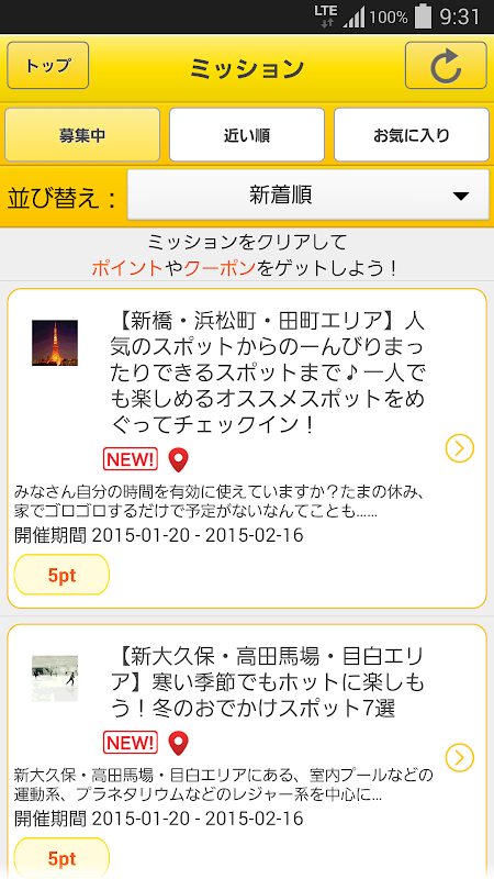 『imaココデ』アプリ内では、キャンペーンを随時開催しています。ミッションと呼ばれるお題に挑戦してボーナスポイントをゲットして下さい!楽しみながらも賢く稼げるアプリでもあります。ミッションも様々あるので、今自分がいる場所から近いところで募集中のミッション検索や、お気に入りミッションの登録もできます。もちろん、新着ミッションが届けば、新着お知らせが表示され、おトクなタイミングを逃さずしっかり活かすことができます。