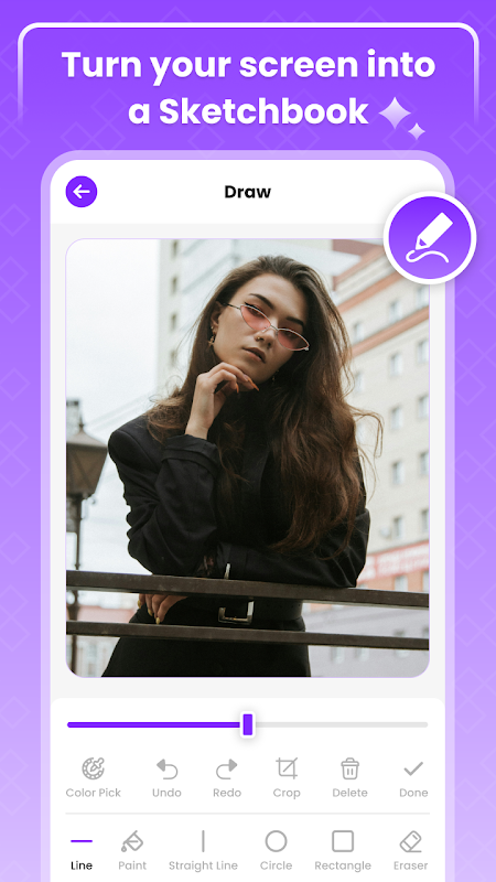 Image Editor Toolbox Converter también te permite usar la función Dibujar, que te permite anotar imágenes de forma creativa con herramientas como Línea, Pintar, Línea Recta, Círculo, Rectángulo y Borrador. Controles adicionales, como la selección de color, deshacer, rehacer, recortar y eliminar, te permiten refinar imágenes con precisión para lograr el aspecto deseado. Prueba la herramienta Redimensionar Imagen, que te permite ajustar las dimensiones de la imagen manualmente o elegir entre los tipos de tamaño predefinidos, como Flexible, Ajustar y Recortar, manteniendo la alta calidad de imagen en varios formatos. Con el Editor de Imágenes, guarda todas tus imágenes en la carpeta Mis Creaciones y compártelas fácilmente con quien quieras a través de redes sociales. La aplicación Image Editor Toolbox Converter es ideal para quienes desean convertir sus imágenes en looks increíbles.