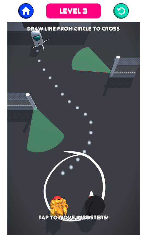 ✓ After drawing a line, press button so that Imposter moves towards point X. It takes the right timing so that Imposter will not get caught by surveillance cameras and prison guards.