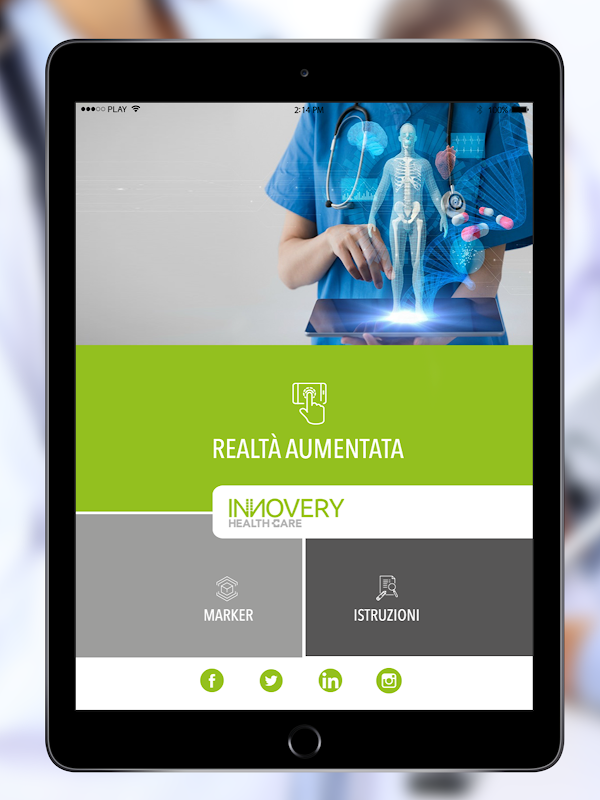 Innovery Healthcare è un App di Realtà Aumentata a scopo informativo che consente di visualizzare, con una tecnologia di ultima generazione, attraverso la fotocamera del proprio dispositivo, una esperienza interattiva, che sovrappone real time, elementi virtuali (Modelli 3D) ed elementi reali dell'ambiente che ci circonda.