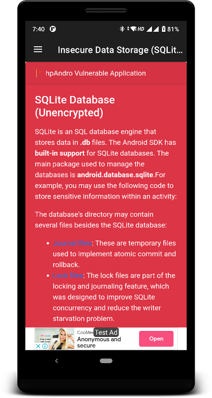 Información de Insecure Data Storage (SQLite) APK