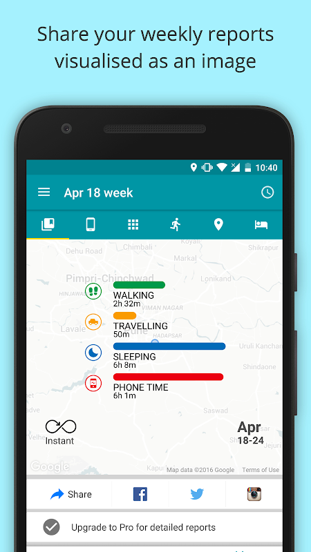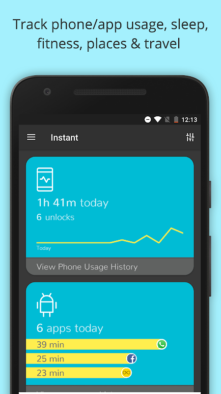 Instant works seamlessly in the background tracking how much time you spend on your phone screen & apps everyday, how much you walk, how much you travel, how long you sleep & how many times you unlocked your phone. Additionally reminders can be set according to your daily limit. It is a great way to stop your phone addiction.