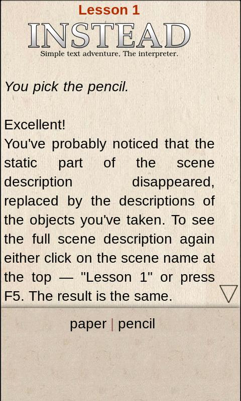 INSTEAD - intérprete de aventura de texto simple. Utilizando en su lugar, puede crear y jugar a juegos que se podrían clasificar como una mezcla de novela visual y la búsqueda de texto.