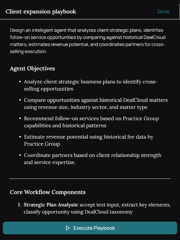 Playbooks: Explora y ejecuta los playbooks de tu empresa directamente desde la app. Los playbooks son flujos de trabajo prediseñados para tareas comunes como análisis de acuerdos, investigación de incorporación y comprobaciones de cumplimiento: comienza con un solo toque y con ejecución guiada en el chat.