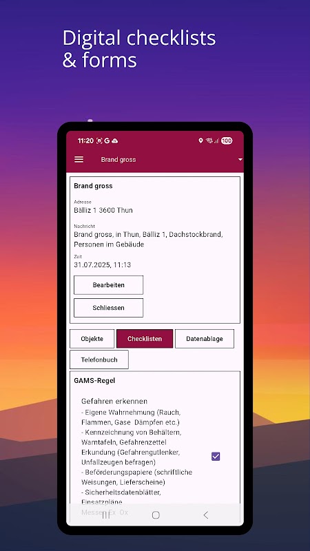 Ya sea un resumen de la situación, información sobre objetos, listas de verificación o formularios, todo está a un solo toque. Intervento ofrece funciones estructuradas e intuitivas que funcionan de forma fiable incluso bajo alta presión. Con alertas push a través de AlarmHub, el incidente se detecta en el dispositivo en segundos, en cualquier momento y lugar.