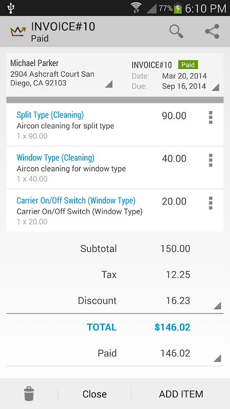 • Seguimiento de facturas y pagos de clientes. Sepa cuándo vence el pago, acepte pagos de facturas y vea el saldo total del cliente. Vea cuánto ganó con el tiempo. Mira quién te debe y cuánto. De esta manera siempre estás al tanto de las cosas.