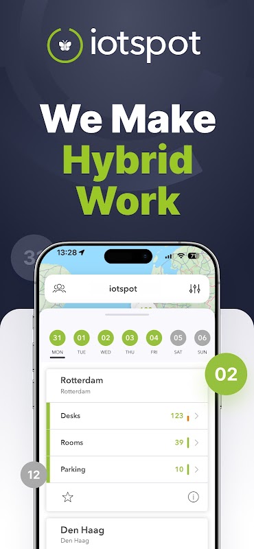 iotspot es una plataforma de espacio de trabajo inteligente para gestionar entornos de espacio de trabajo flexibles. iotspot se basa en múltiples módulos de software y hardware de espacio de trabajo. Con la aplicación iotspot puedes ocupar un espacio de trabajo en el momento o reservar con antelación desde casa.
