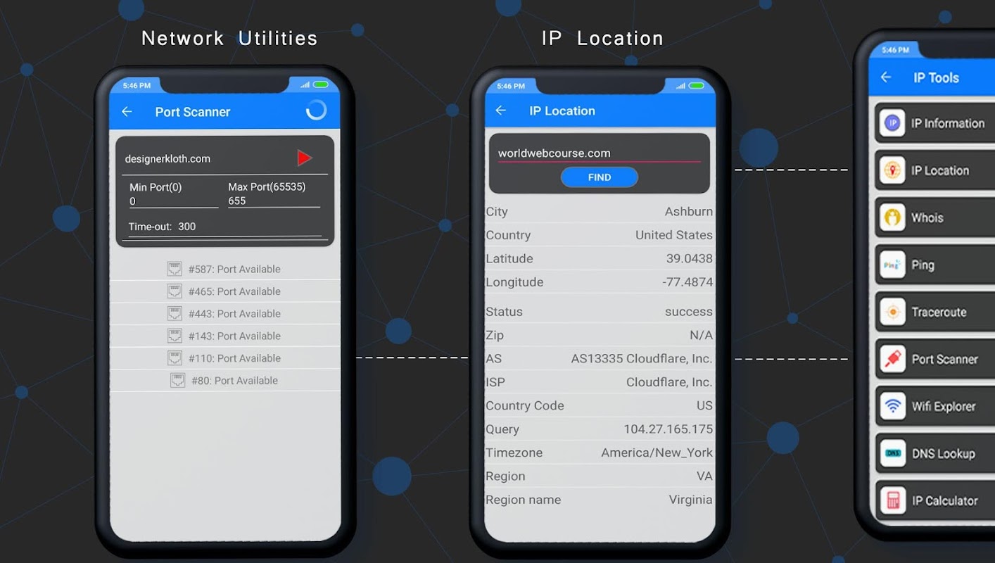IP Network Tool is Contain IP Information, IP Location, Whois Command, Ping, Traceroute, Port Scanner, DNS Lookup, IP Calculator, IP Host Converter.