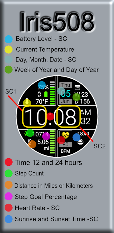 La esfera del reloj Iris508 ofrece una experiencia versátil y altamente personalizable, combinando simplicidad con un completo conjunto de funciones. Está diseñada para relojes Android con nivel de API 34 y superior. Aquí tienes un resumen de sus funciones principales: