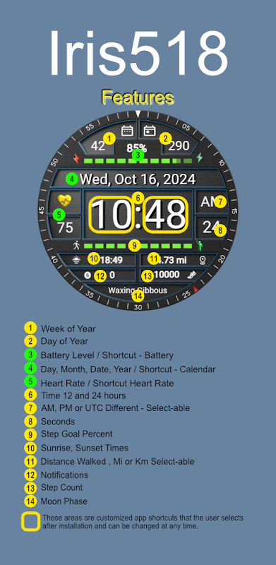 La esfera del reloj Iris518 tiene como objetivo brindar una experiencia consistente en varias plataformas de relojes inteligentes, pero algunas características pueden variar según el modelo de reloj. Si bien las funciones principales, como las opciones de hora, fecha y batería, están diseñadas para ser accesibles en la mayoría de los dispositivos, ciertas funciones pueden comportarse de manera diferente o no estar disponibles en todos los relojes debido a diferencias de hardware o software.