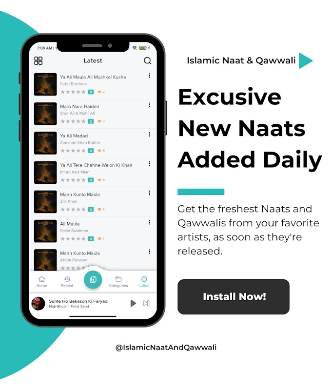 Esta aplicación tiene una colección masiva de más de 10,000 Naats y Qawwalis de todos los Qawwals y khawan famosos, incluidos Sabri Brothers, Abdul Habib Ajmeri, Abida Parveen, Owais Raza Qadri, Ghulam Mustafa Qadri, Hafiz Ahmed Raza Qadri, Muhammad Asif Chishti, Nusrat Fateh. Ali Khan y Syed Faishuddin.