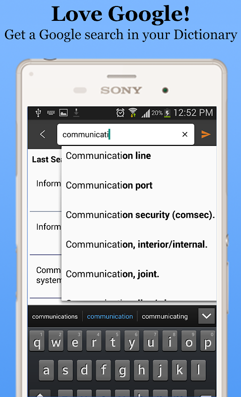 • You can see your last search words with time of searched, on main screen and can check meaning any time.