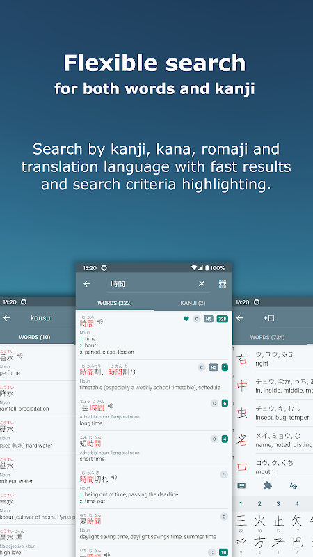 • Busca entre más de 6000 kanji usando lecturas, radicales, número de trazos, niveles y más desde un solo campo de texto.