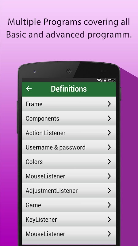 Esta aplicación lo ayuda a consultar una gran colección de programas Java sobre la marcha y lo ayuda a mejorar el pensamiento lógico de varios problemas relacionados con la programación. Es una aplicación para proporcionar código fuente y salida para varios programas Java.