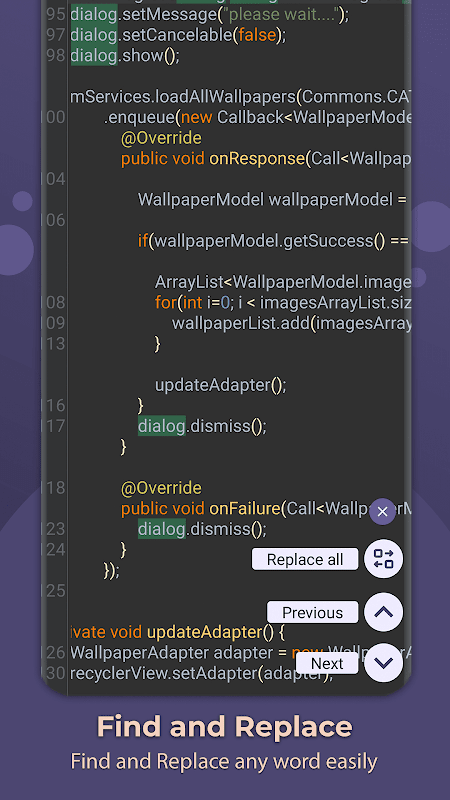 Puede habilitar/deshabilitar diferentes configuraciones del editor de Java fácilmente desde la configuración, es decir, finalización automática de código, sangría automática, pellizcar para hacer zoom, número de línea, etc. El visor de Java es una herramienta muy poderosa que también admite buscar y reemplazar a través de que puede encontrar cualquier palabra fácilmente y reemplazar con otra palabra.