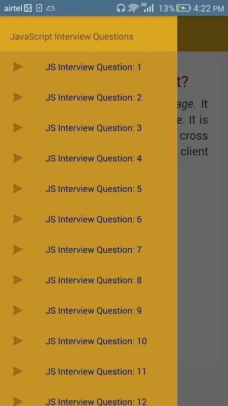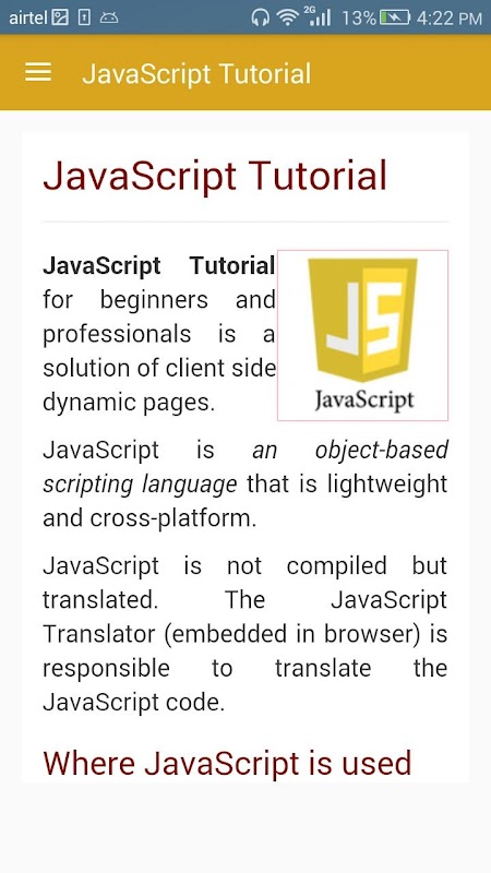 JavaScript aplicación para Android ofrece tutoriales, preguntas de la entrevista y cuestionario.