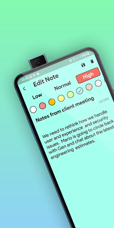 • Add Color and add priority to code notes to quickly organize and get on with your life. If you need to find something you saved, a simple search will turn it up.